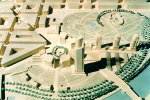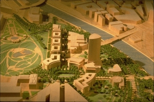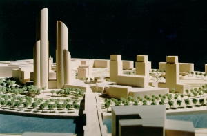 El año 1993 el Ayuntamiento de Bilbao convocó una Consulta Internacional para definir la Ordenación Urbana del area de Abandoibarra en pleno corazón de la ciudad, entre el Museo Guggenheim y el Palacio de Congresos. A la Consulta fueron invitados cinco equipos, entre ellos el formado por Cesar Pelli & Associates, Balmori & Associates y Aguinaga & Asociados. Otros participantes fueron Ricardo Bofill, Jose Antonio Fernandez Ordoñez, Eduardo Arroyo y Francisco Mangado. Con fecha 8 de Junio de 1993, un jurado que incluia entre otros a Francisco Javier Sainz de Oiza, Oriol Bohigas y Luis Fernandez Galiano, decidió que la alternativa presentada por el equipo de Cesar Pelli, Diana Balmori y Eugenio Aguinaga era la que ofrecia "mas soluciones a los problemas especificos" planteados. Sobre un area de 300.000 m2 , y con una edificabilidad de 210.000 m2, se propone un desarrollo urbano con una mezcla de usos que incluye oficinas, apartamentos, un centro comercial, un hotel, una biblioteca universitaria y abundancia de zonas verdes que ocupan hasta un 70 % del area de intervencion. A peticion del Ayuntamiento se presentó en 1994 una segunda variante de la propuesta. Finalmente en 1998 fué aprobada una tercera solución actualmente en proceso de desarrollo. |