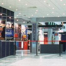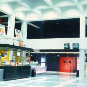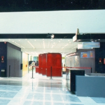 - Ticket booths, offices and other service facilities are located adjacent to the main square volume in the entrance. The design of the ticket booths allows for an easy control and provides space for the wide access ramp to the foyer. The latter, because of its generous dimmensions, is the right place for fast-food services and merchandising before going into the pictures. |