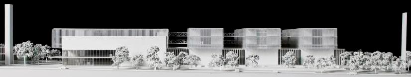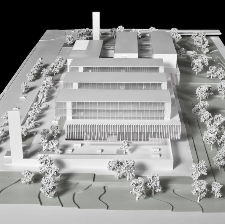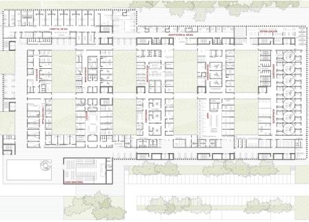 inclemencias del tiempo. El esquema del edificio es el de un peine de volúmenes edificados limitado en sus extremos Norte y Sur por las galerías de comunicaciones, una para público y otra para médicos y personal. El conjunto del edificio se inscribe en una retícula de 6,60 m. x 6,60 m. que permite disponer de una gran variedad de de dimensiones de estancias (2,20 m., 3,30 m., 4,40 m., 6,60 m.) al tiempo que resulta económica desde el punto de vista estructural. |
