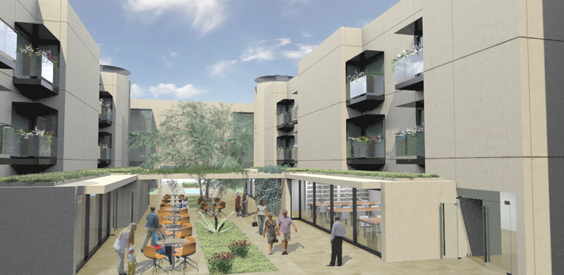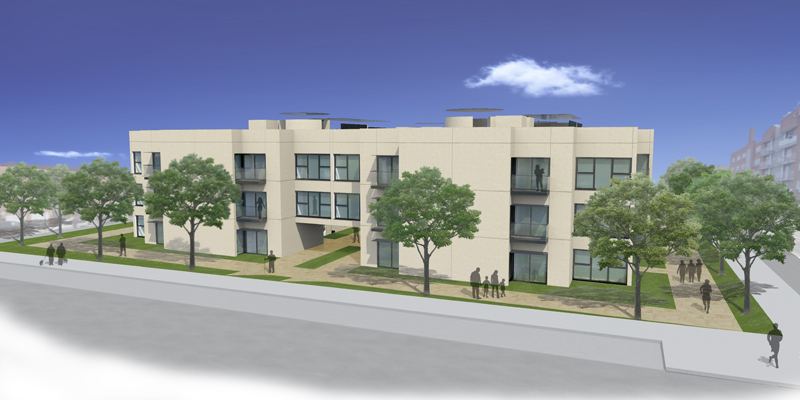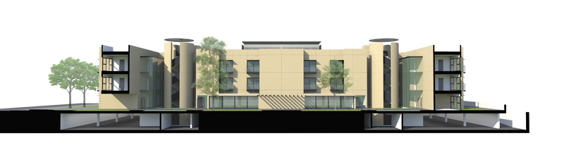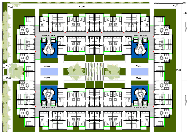 | Because of the small size of the apartments, one or two bedrooms, our proposal is to organize the dwellings in a kind of cluster as in the monachal medieval architecture.Four vertical cores ,with 19 apartments each, are located in the four corners of the interior garden.54 are 1 bedroom units and 22 two bedroom units. Because it is a house for elder people that may have discapacities, all flats are designed for wheelchairs. All apartments enjoy a small terrace that provides sun, fresh air and flower space for everybody |