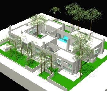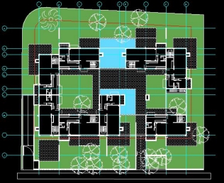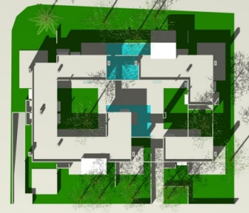 The program requested by the client consisted of two or three-story houses with high quality materials and construction and floor areas ranging from 120 to 140 m2, all with access to a private green area, and with a common entrance and garage. The building is configured as a "low profile multifamily residential building", reflecting the physiognomy of the original garden city by Zugazarte. Within the offset of the building from the roadway, a two-story apartment building with 8 multifamily dwellings, all of equal volume, was designed on a floor plan with dimensions of 12.80 m x 6.40 m between axes. This building winds between the existing trees, which were preserved almost in their entirety, giving rise to two open patios connected to each other, around which the entire building revolves, and from which the dwellings are accessed. These patios have green areas and separated by two surfaces of water, one a pond and the other a swimming pool. On the perimeter of the lot, a green "ring" is formed in which each dwelling has a clothesline, a paved terrace and a private green area. The common entrance to the dwellings is through a pedestrian street that gives onto the previously described patios. The building has a garage in the basement, shared by all the dwellings and with independent access from each dwelling. After the first project, the same client requested a solution