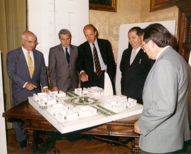 D.Luis Armada, Gerente Municipal de Urbanismo, D.Angel Rodríguez Hervás,Gerente de la EMV, y D.Javier García Valcarcel, gerente de la Comisión Gestora del Ensanche de Vallecas, estudian en la Casa de la Villa la maqueta del nuevo Centro Urbano siguiendo las explicaciones de D.Eugenio Aguinaga y D.José M.J.Urrutia de Aguinaga y Asociados. |