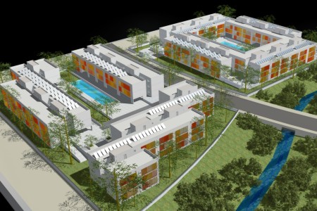 This was a project according to the "garden city" housing typology dominant in the urban setting. The very high density foreseen in the master plan, in contradiction with the low maximum height permitted (3 floors), led us to a solution in which the different buildings are linked to form a closed block in one case and an open fretwork-like design in the other. Construction was planned to use very thin precast concrete panels installed perpendicular to the façade. The interior of the dwellings has two clearly distinguished