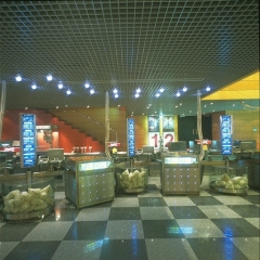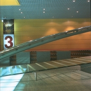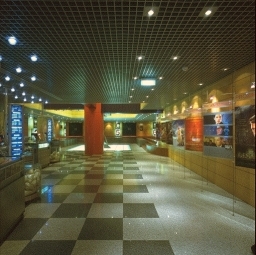 El Hall de los Multicines de "La Vaguada", primeros que se instalaron en Madrid hace ya más de 12 años, precisaba una renovación en profundidad tanto por motivos de funcionamiento como por motivos de diseño y acabados. La reforma ha llevado las taquillas a la fachada del local y ha derribado tabiquería innecesaria con el fin de dotar al vestíbulo de una mayor amplitud visual. El área de actuación se estructura en dos zonas. En la primera se sitúan los servicios de bebidas y fast-food para los que se ha diseñado un módulo de venta de acero inoxidable y cristal, con iluminación por fibra óptica y servicio de bebidas mediante unas mangueras transparentes que descuelgan del techo. El conjunto de módulos de venta forma una especie de tren articulado que da una gran flexibilidad a la organización del espacio en esta zona del vestíbulo. |