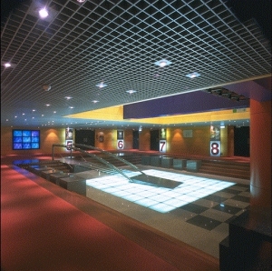 Hay una segunda zona de estancia y acceso a las salas con gradas de madera de jatoba y pavimento de granito negro Badajoz y blanco cristal y moqueta roja resistente al fuego. En el centro de este espacio se dispone un suelo modular de cristal iluminado por su parte inferior a modo de gran fanal de luz del que arranca una rampa de acceso para minusválidos que ha sido utilizada como tema central de composición de todo el proyecto. Esta rampa de 3.60 m. de luz está ejecutada exclusivamente a base de vidrio laminado trabajando a compresión gracias a la colaboración de un sistema de cables tensados y pendolón en su parte inferior que absorben las tracciones de los esfuerzos de flexión. El techo del local se ha resuelto mediante un entramado en chapa de acero gris metalizado. |